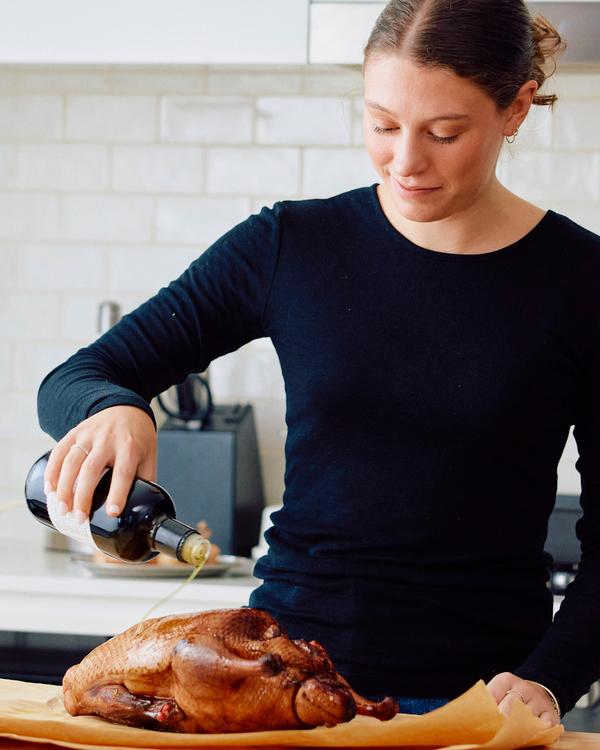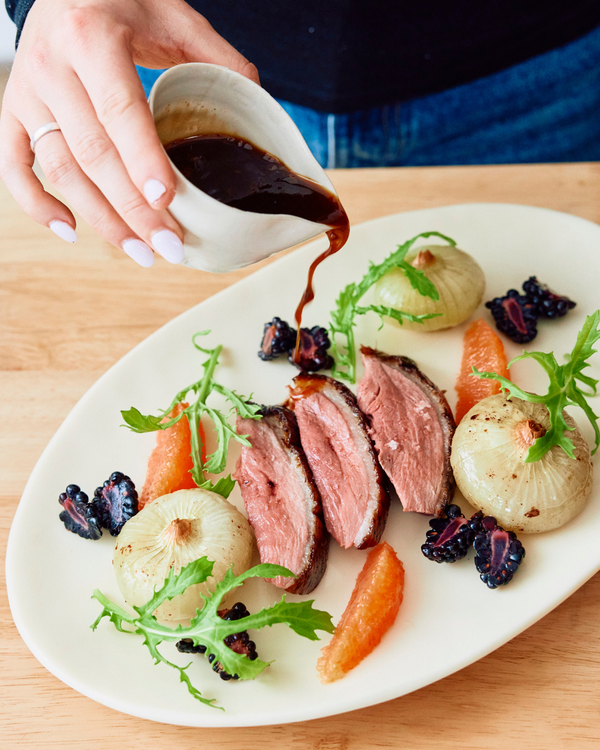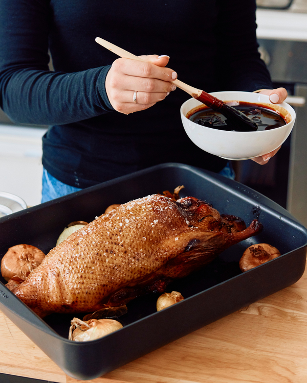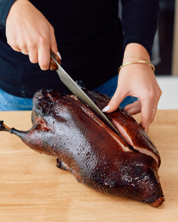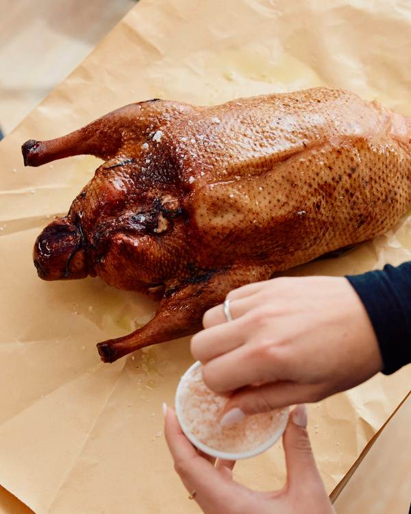 This large duck from Great Ocean Ducks is glazed with Marionette cassis, star anise, Shaoxing wine and Chinese five-spice, then aged for a week in our Meatsmith duck room. To prepare it at home, add an extra layer of lacquer and roast it, serving it with roasted onions, orange segments and a rich red wine jus. We eat the leftovers with spring onion pancakes for lunch on Boxing Day.