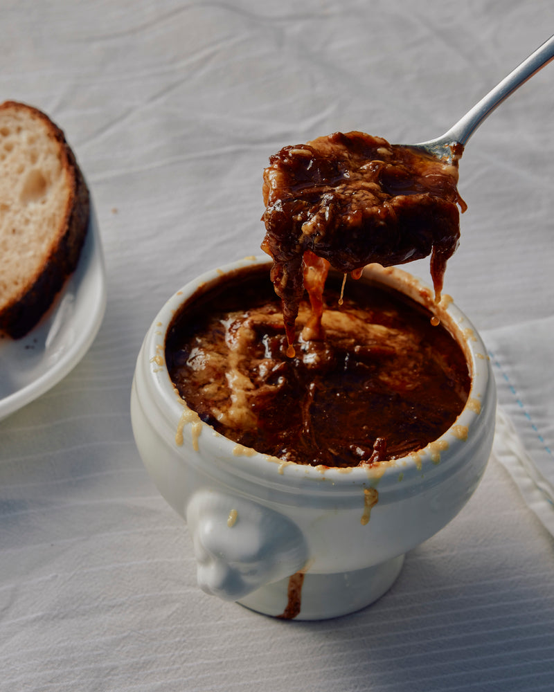 Our take on the classic French onion soup used O’Connor Beef oxtail for extra lusciousness. We added it to a braise made with onions caramelised slowly in butter for hours, our beef stock, Madeira and fresh thyme. We recommended serving this in oven-proof bowls, topped with baguette slices and shavings of Comté, baked until the cheese is golden and bubbling.