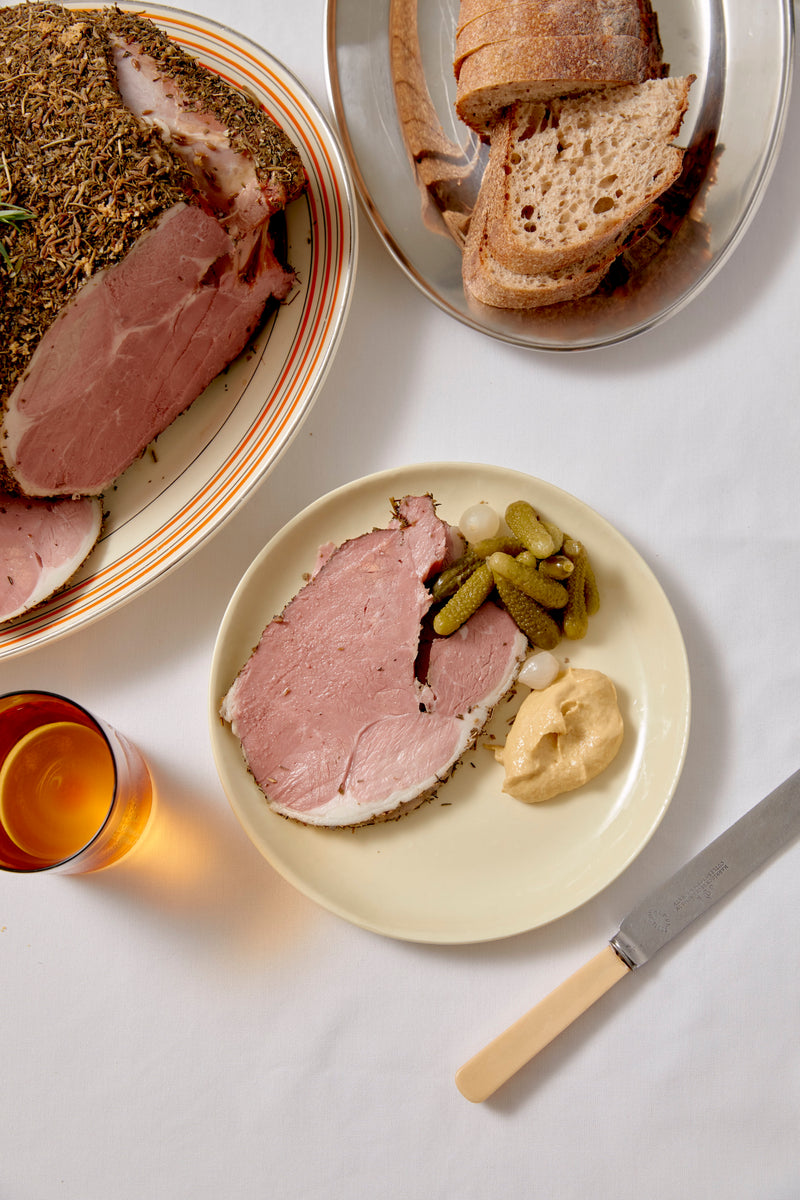 A whole lamb leg, brined and generously seasoned with Herbes de Provence – fragrant and floral. Slow-smoked in the style of a ham, yielding tender, deeply flavoured meat that’s ready to serve, hot or cold. Effortless and abundant, it's great for a large group.