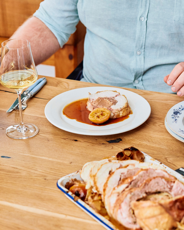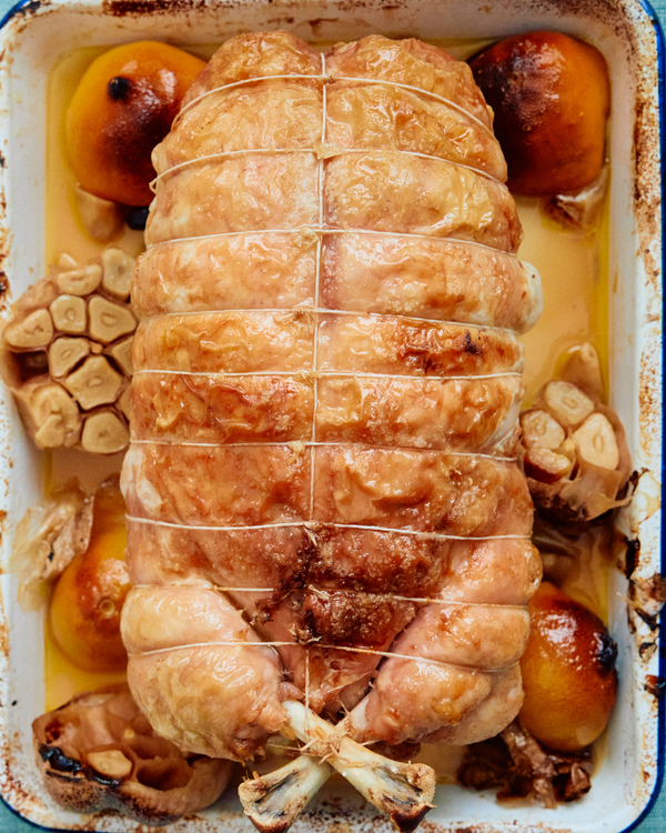 Each year, I make a version filled with flavours I love. This one takes its cues from my travels and my love of classic French cooking: a rich farce wrapped around a log of foie gras, then encased in soft confit leek. It’s the ultimate roast chicken."